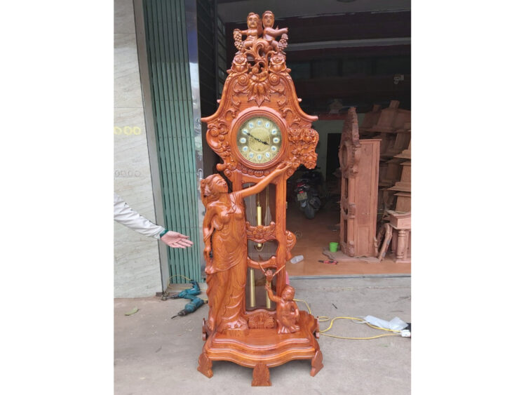 Chiếc đồng hồ phòng khách được chế tác bằng 100% chất liệu gỗ gõ đỏ với các họa tiết trạm trổ cực kỳ tỉ mỉ. phần riềm được trạm trổ hoa lá tây kết hợp hoa hồng về tượng chính trạm cô tiên và gồm 3 tượng nhỏ bổ sung.
