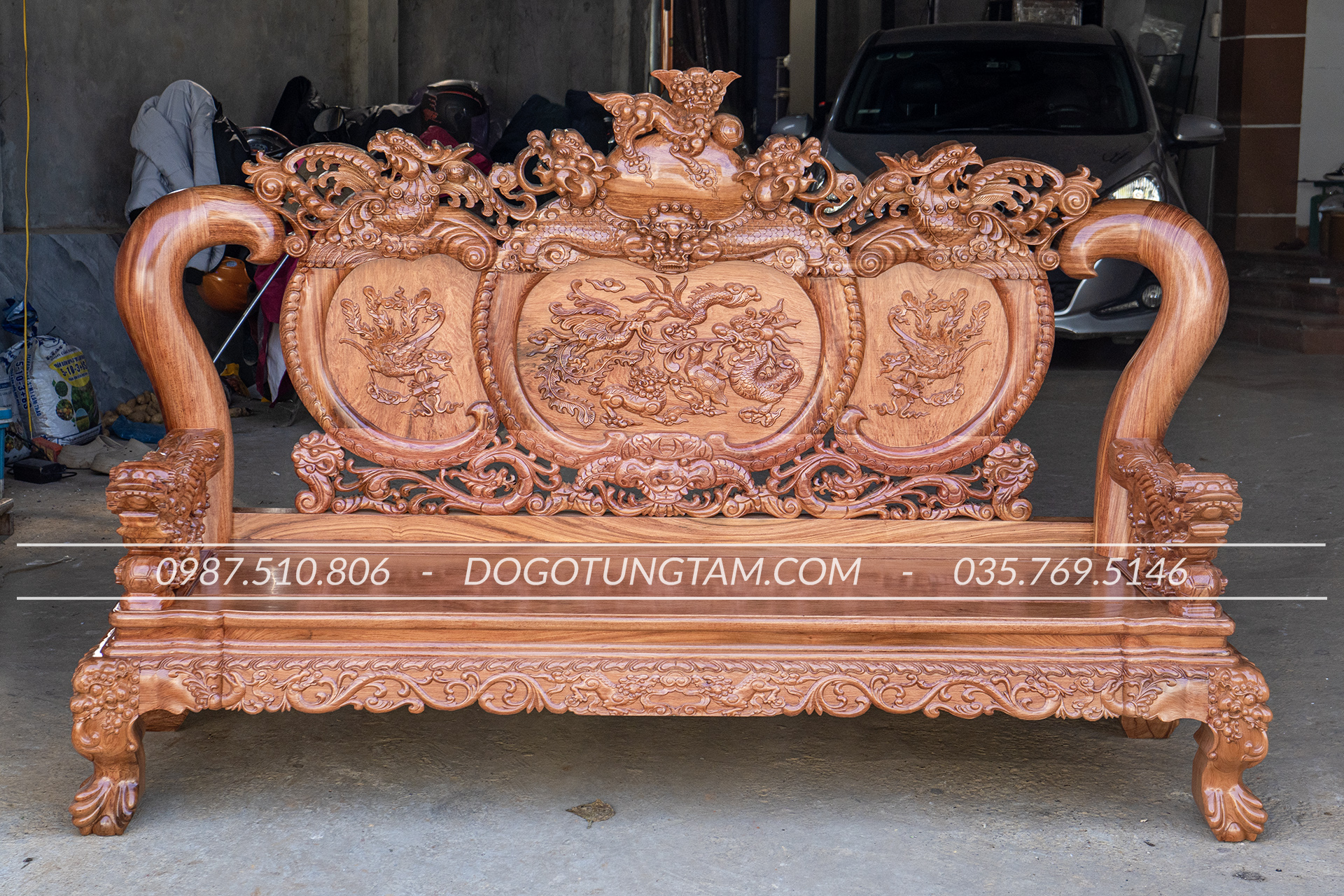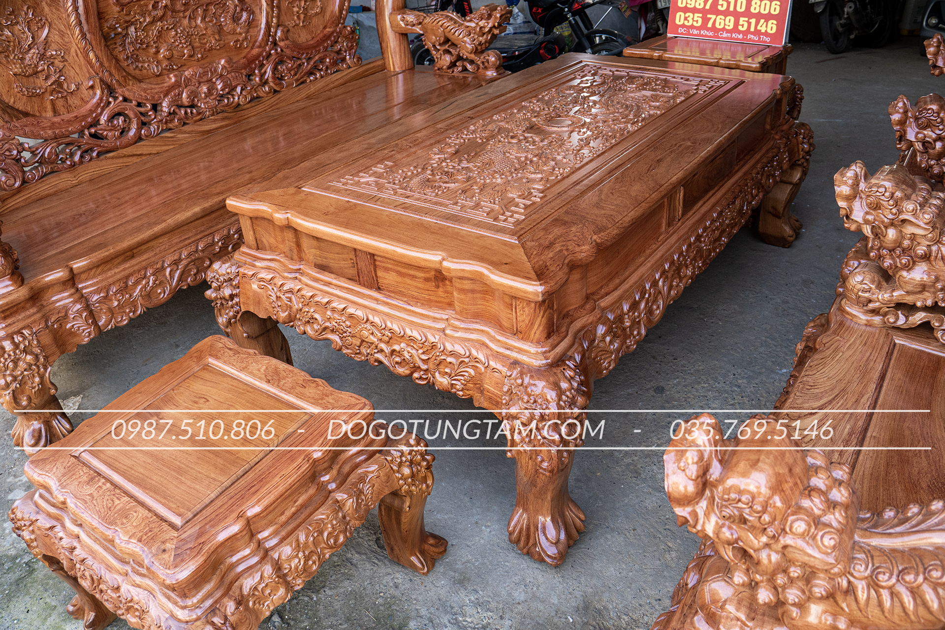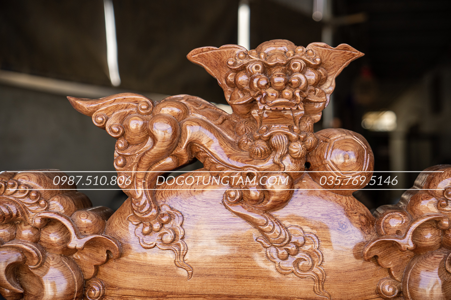 Hoàn thiện: Đục tay thủ công, đánh vecni hoặc PU cao cấp