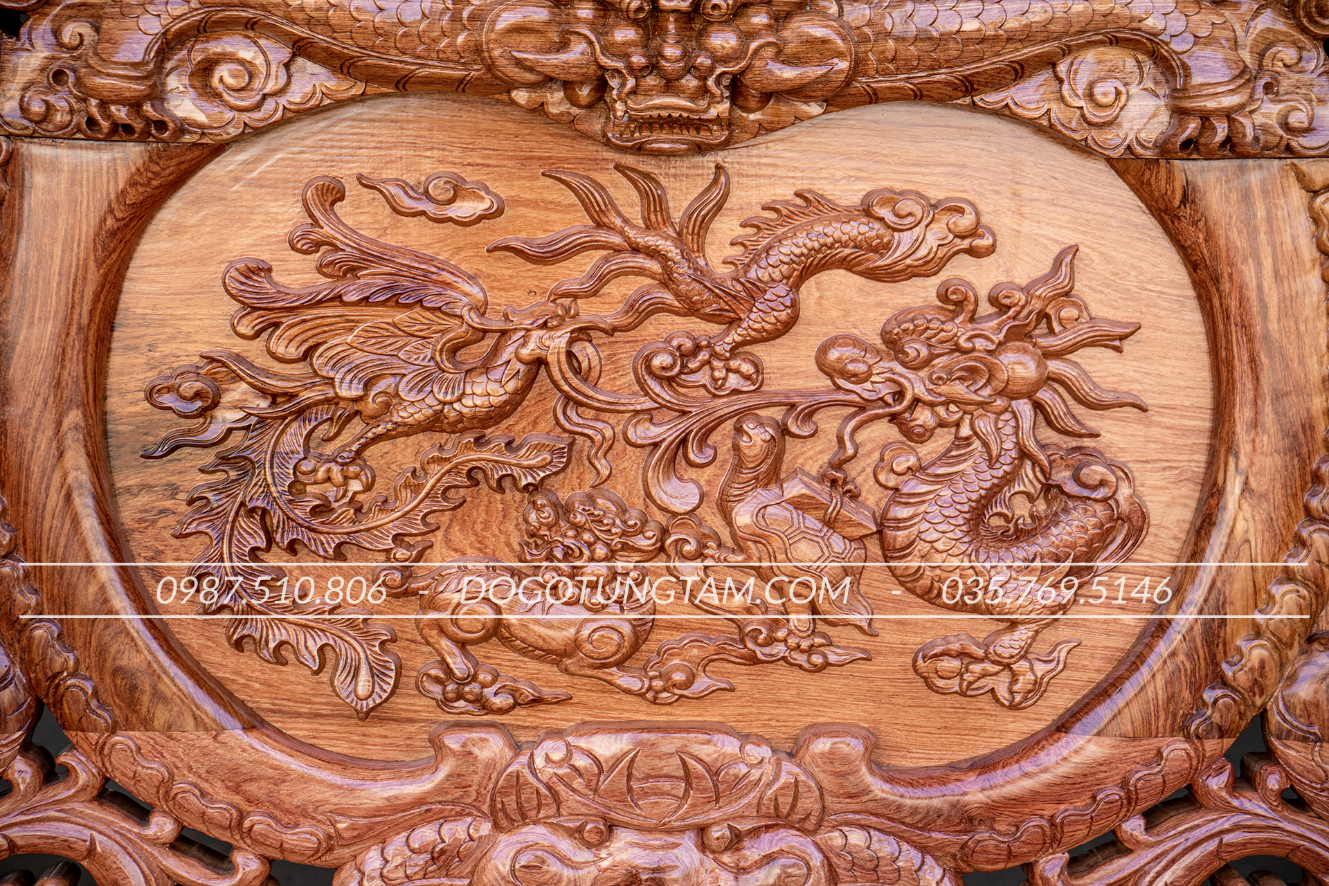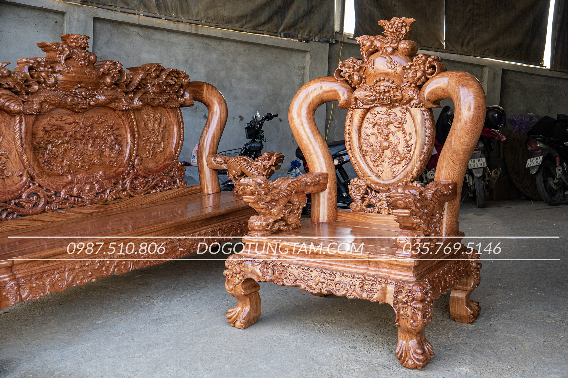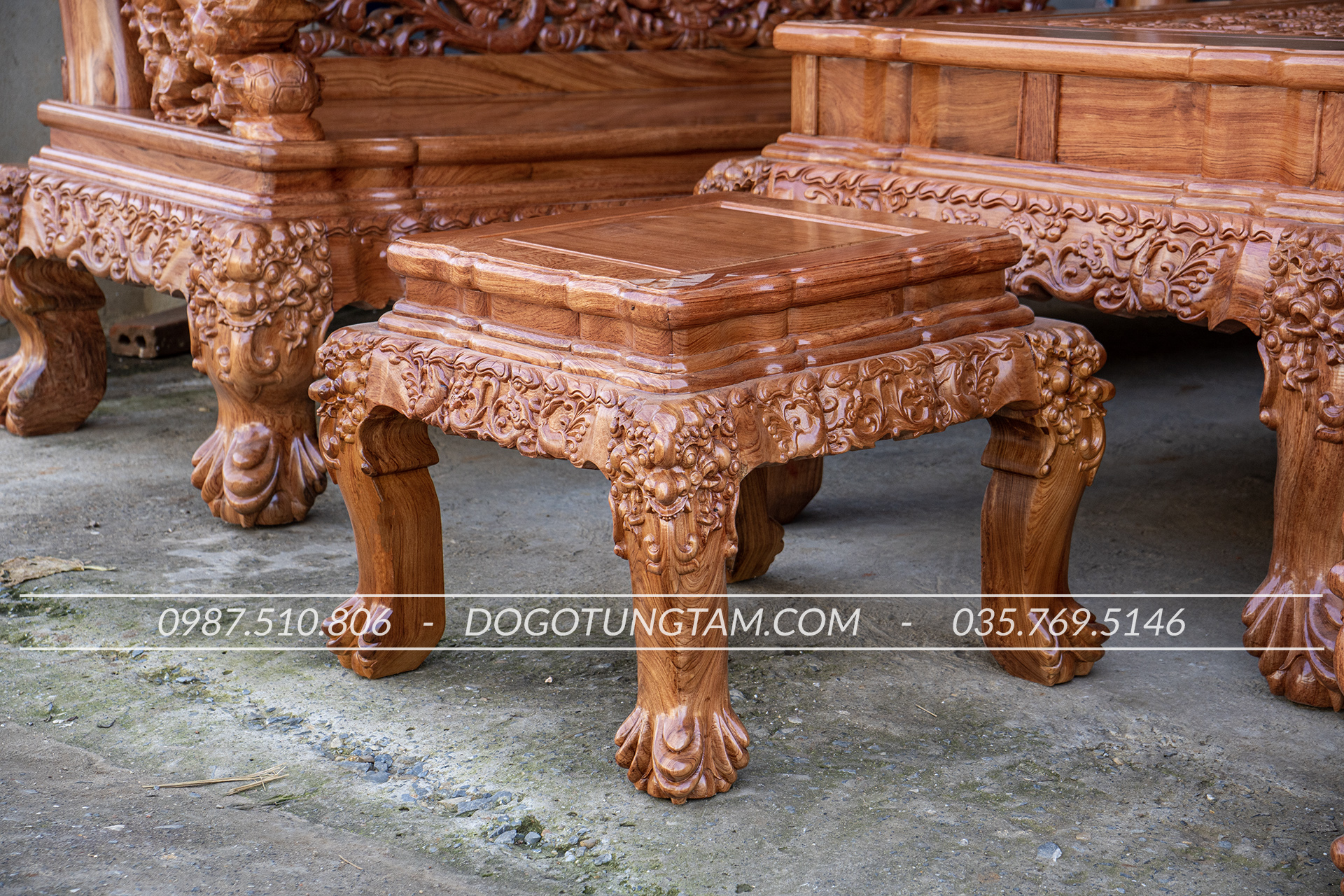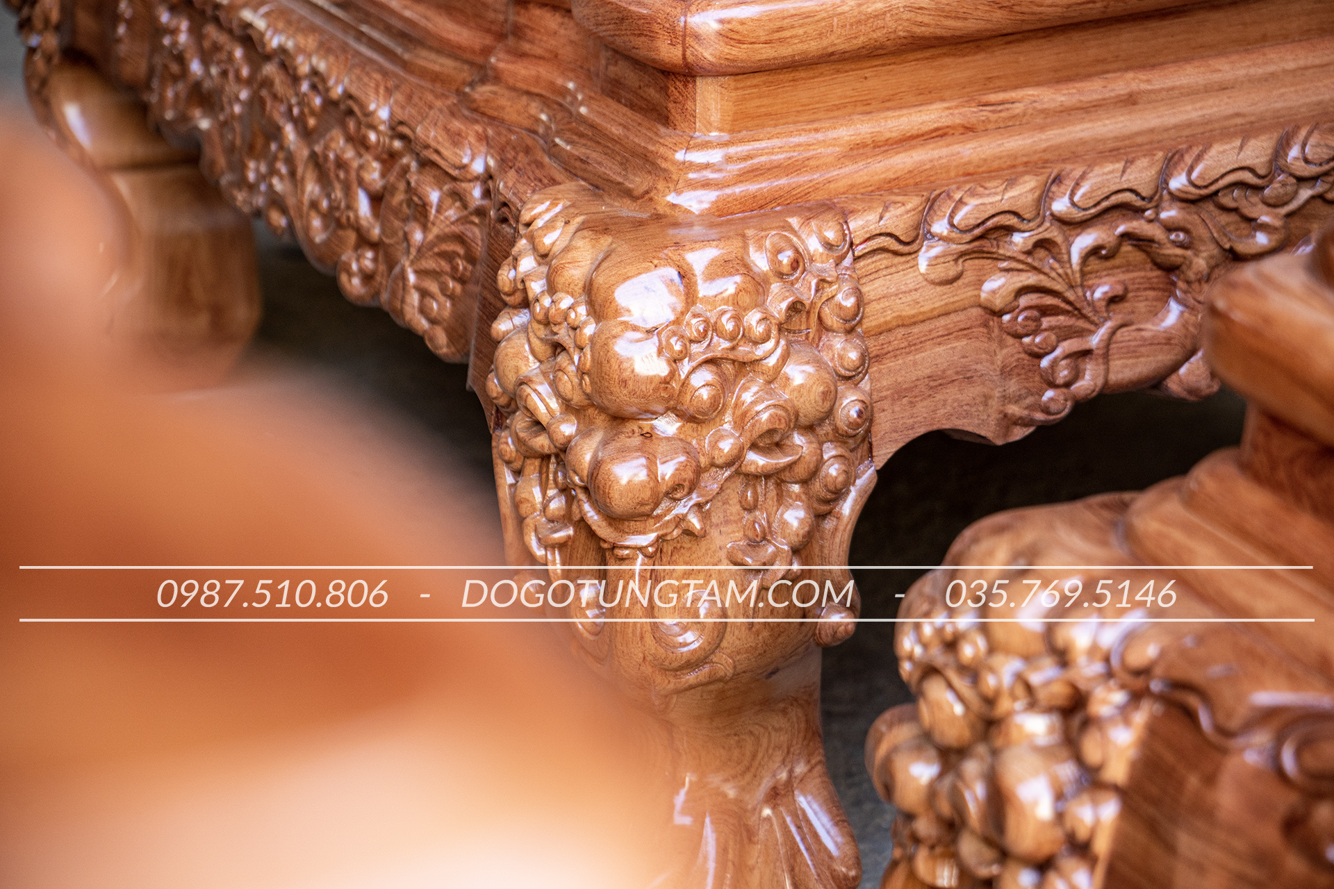 Hoàn thiện: Đục tay thủ công, đánh vecni hoặc PU cao cấp