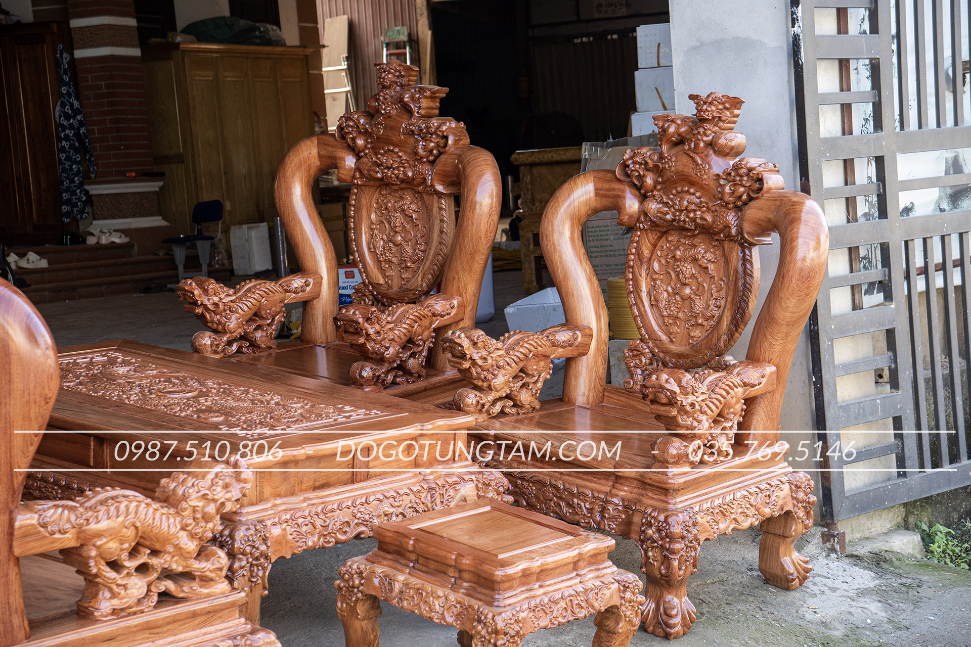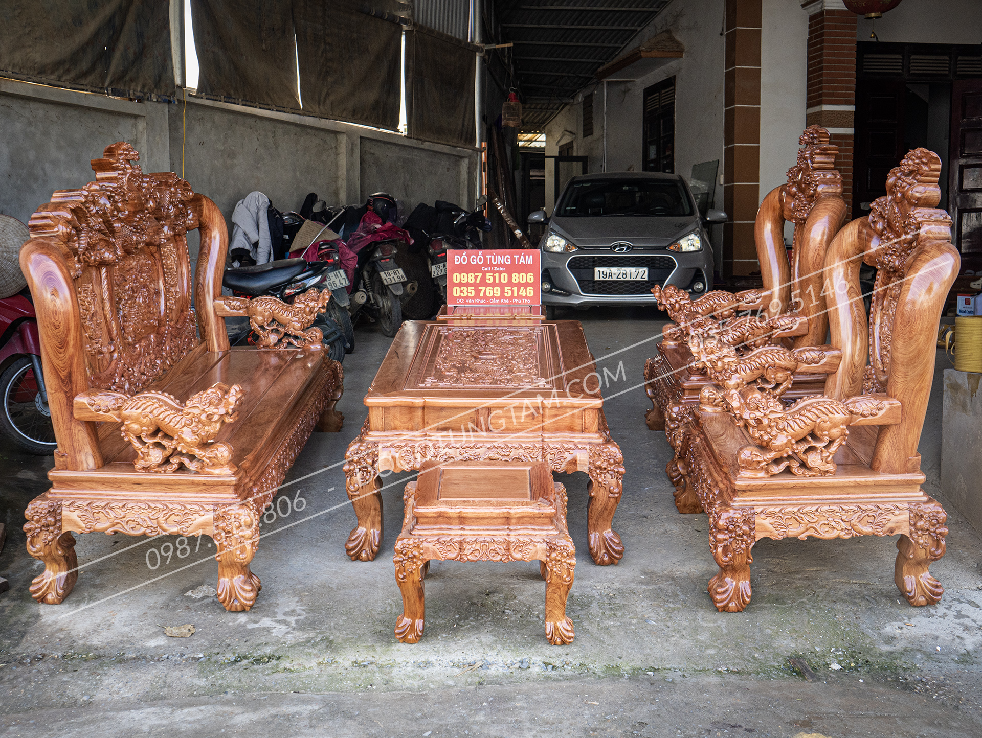 Toàn bộ hoa văn được nghệ nhân chạm tay, đường nét sâu, đều, thể hiện trình độ thủ công cao. Mỗi bộ ghế là một tác phẩm nghệ thuật gỗ thực thụ.