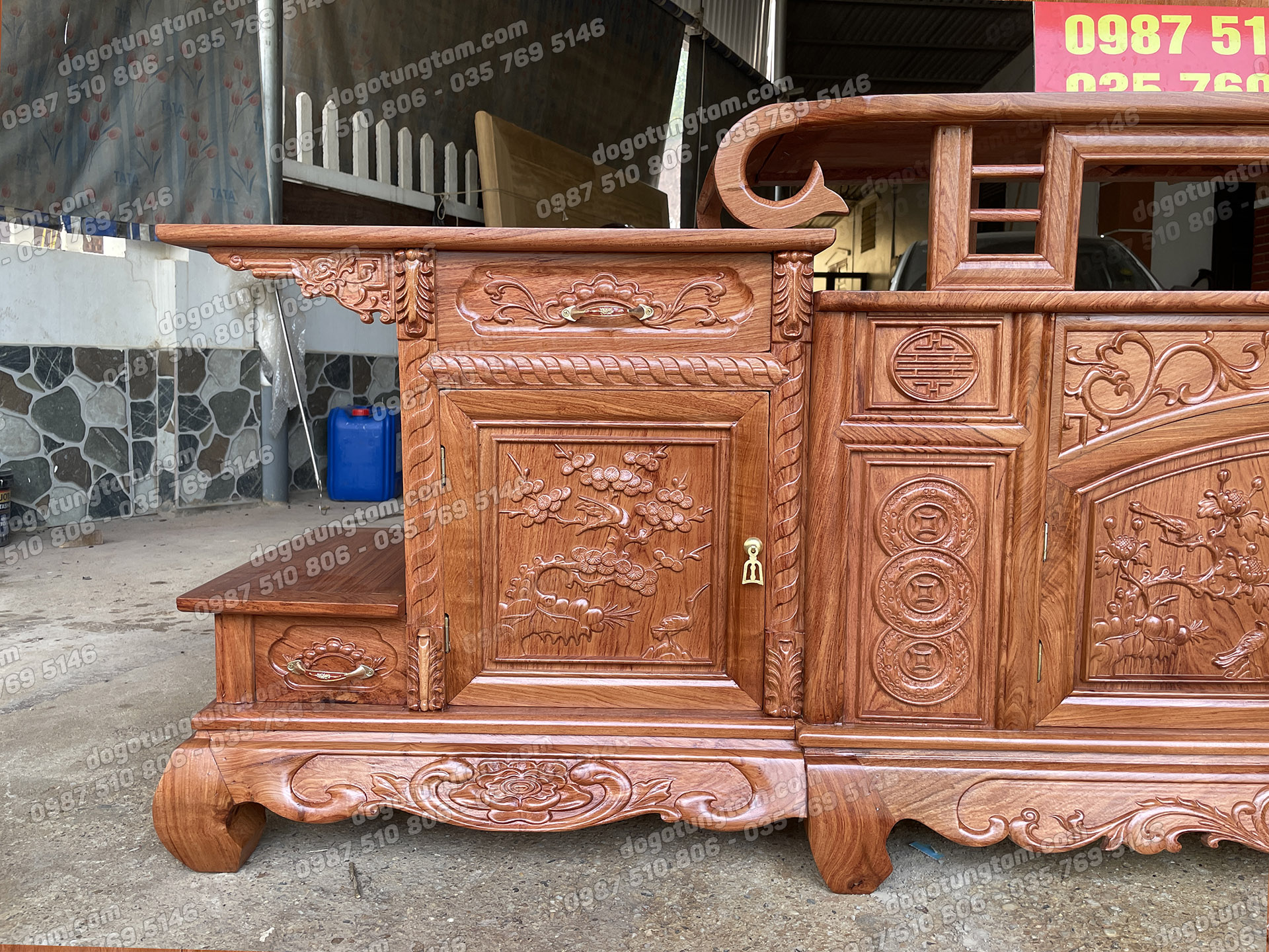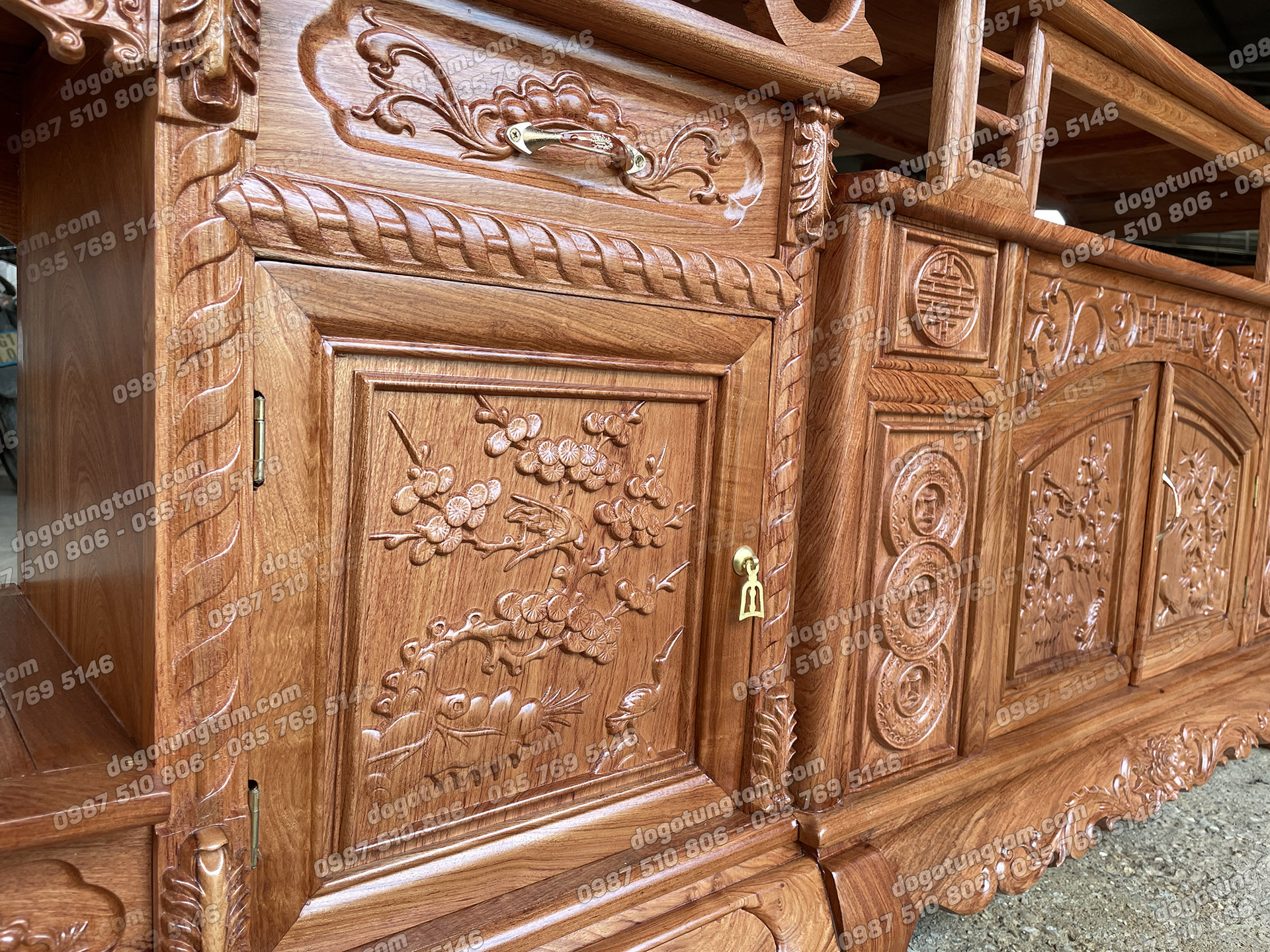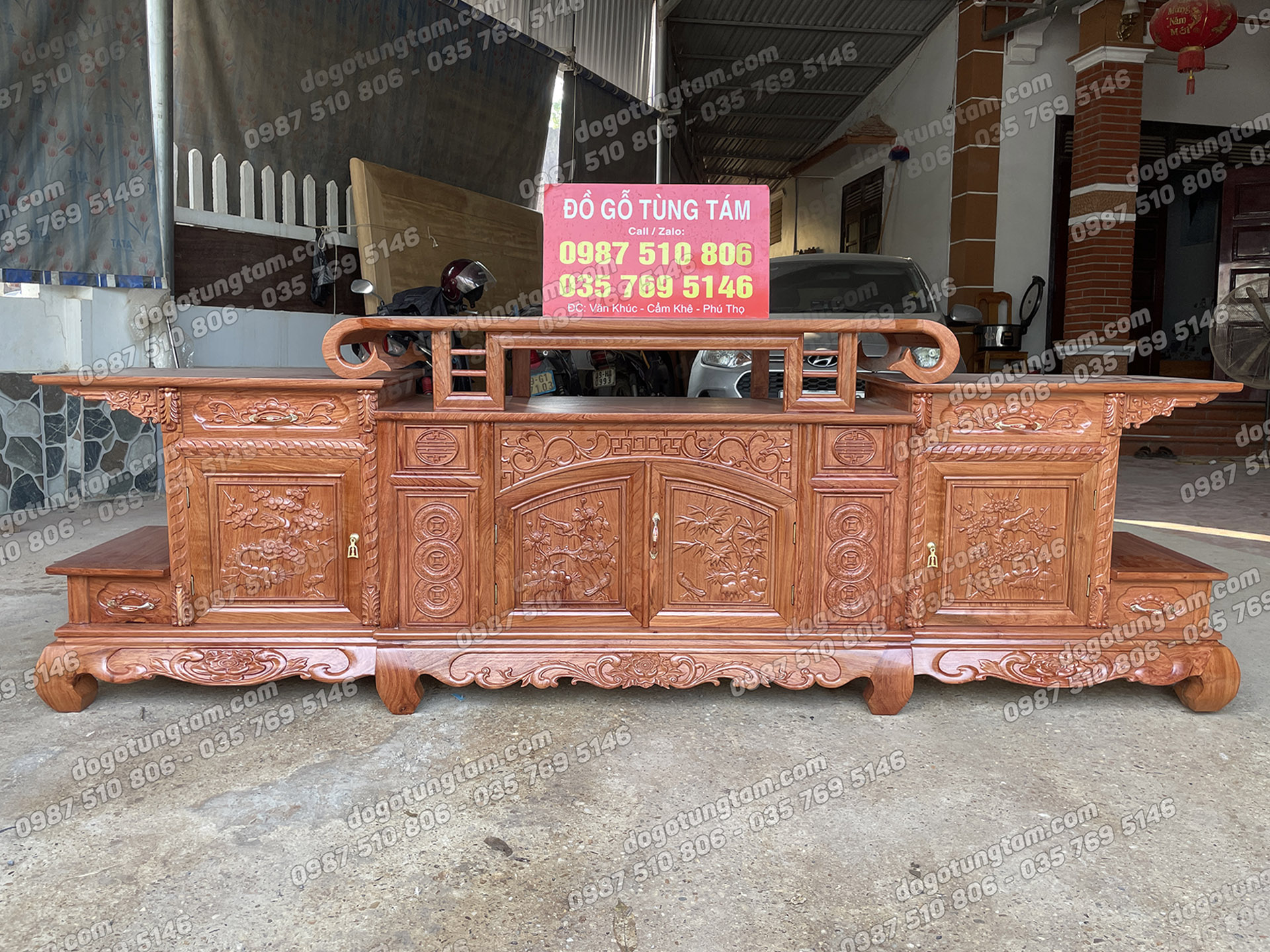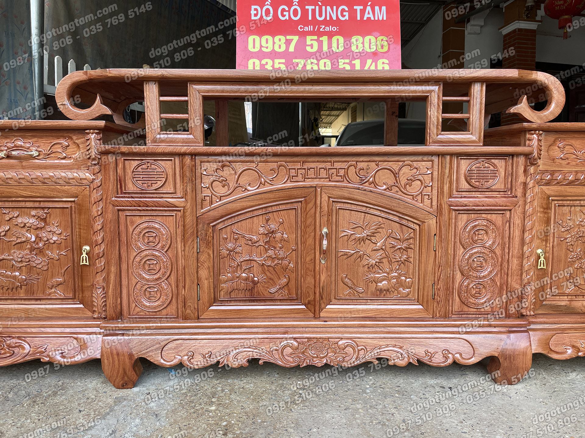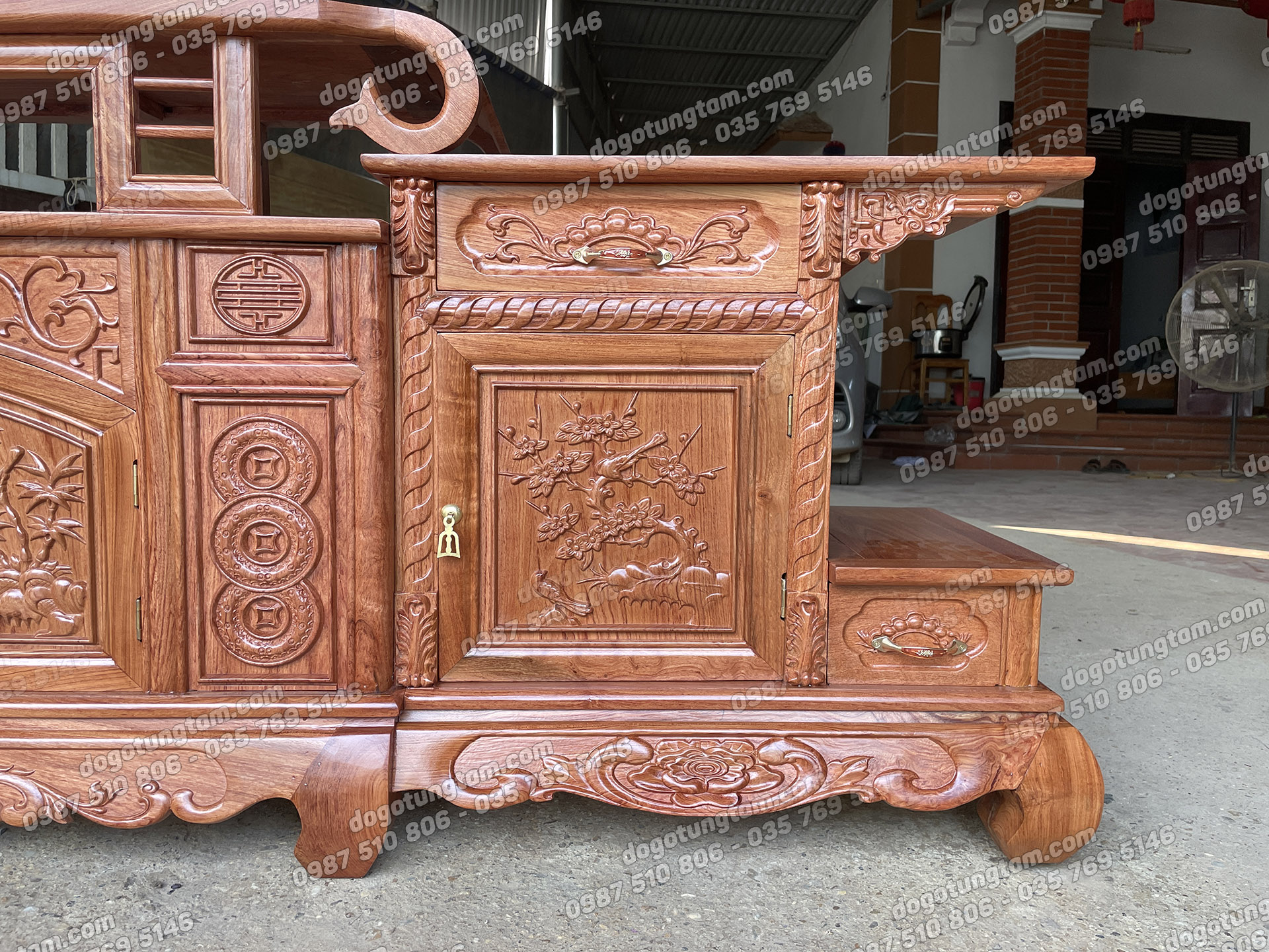 Kệ Tivi Sừng Trâu Dài 2m4 Cánh Đục Tứ Quý Gỗ Hương Đá